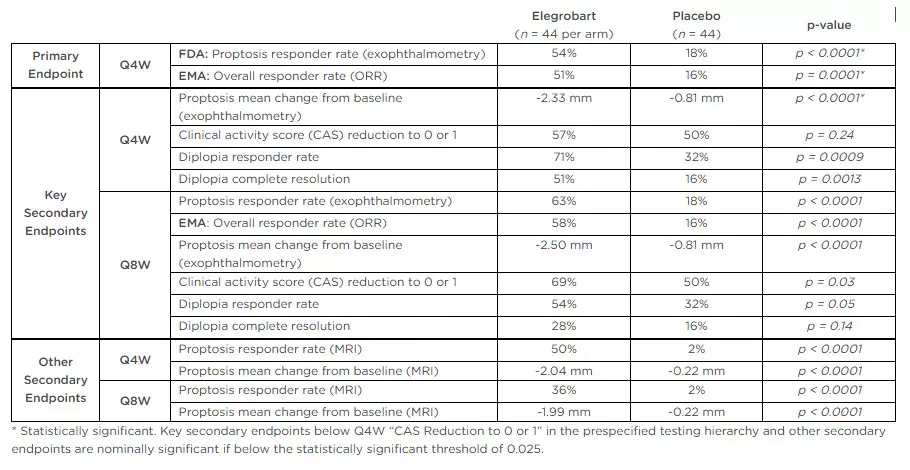 REVEAL-1 was highly statistically significant on its primary endpoint of Q4W proptosis responder rate and the key secondary endpoint of Q4W proptosis mean change from baseline, each at week 24 as measured by exophthalmometry. REVEAL-1 also assessed elegrobart Q8W versus placebo and additional clinically relevant endpoints for both the Q4W and Q8W dosing arms. Detailed results are presented below: