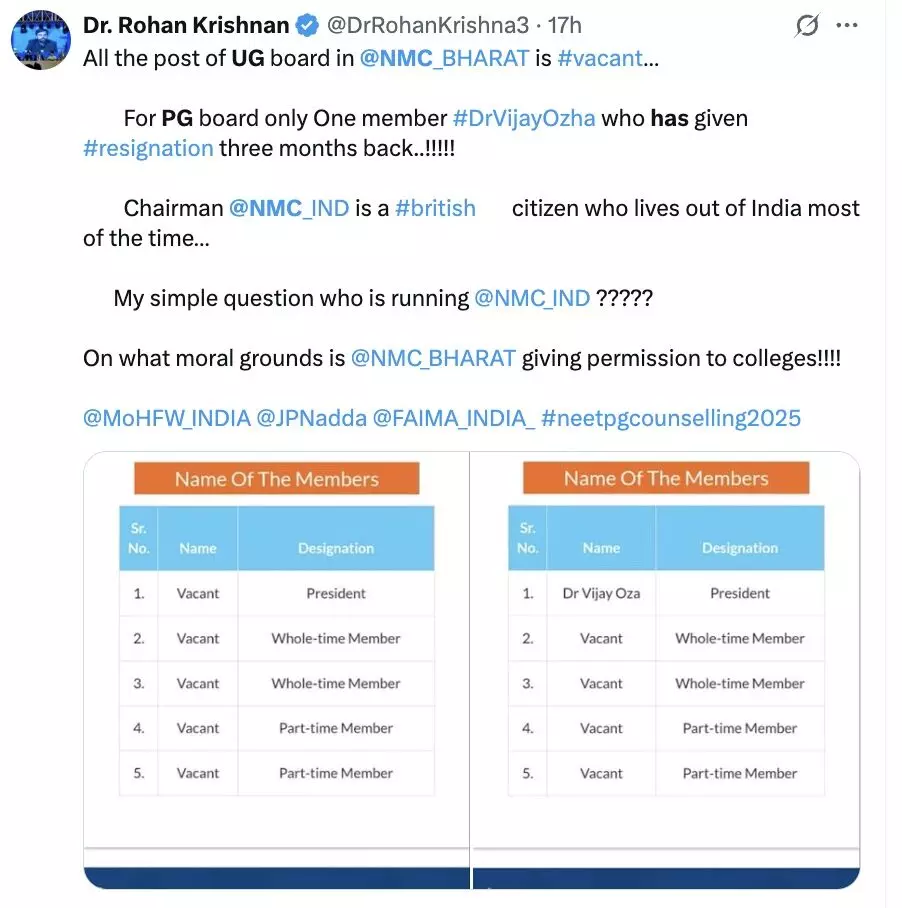 Amid this situation, NMC is facing backlash for the delay and vacant posts in its PG board. Taking to X, the founder of the Federation of All India Medical Association (FAIMA), wrote, “As #NMC hasn’t sent their assessment report to #MCC(Medical Counselling Committee) till now. #NMC is running without proper number of staff! Current #NMC Chairman is least bothered like he had been while being chairman of #NBEMS.”