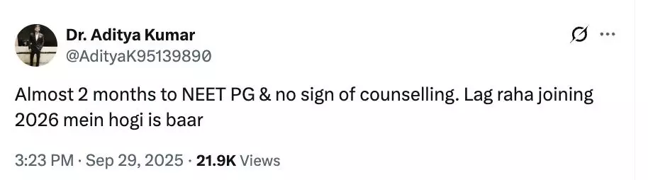 Taking to X, one user wrote, “@NMC_BHARAT Kindly release the Counselling schedule for NEET PG. It’s been more than a month since the result, and no update on Counseling. As per NMC president Counseling was supposed to happen in Sept. #neetpg2025 @JPNadda #nodelay #NEETPG #neet #counselling #neetpgcounselling”