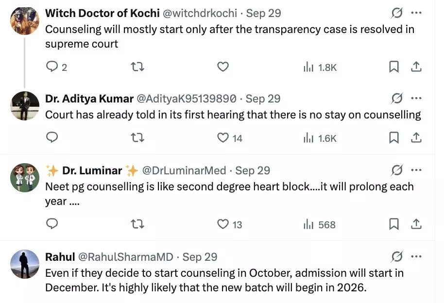 “MCC is taking its own sweet time in conducting Neet Pg counselling, not realising that the tertiary care hospitals are functioning with only 2 batch of overworked residents…kyunki ground reality se unka lena dena thodi hai :)” read the X post of one such user.