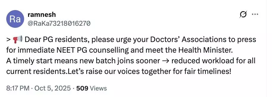 “Dear PG residents, please urge your Doctors’ Associations to press for immediate NEET PG counselling and meet the Health Minister. A timely start means new batch joins sooner → reduced workload for all current residents.Let’s raise our voices together for fair timelines!” wrote an X user.