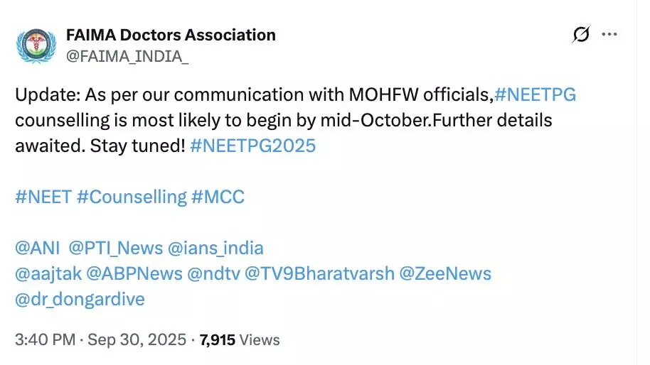 Meanwhile, the Federation of All India Medical Association (FAIMA) recently hinted at the possibility of the NEET PG counselling being started by mid-October. “Update: As per our communication with MOHFW officials,#NEETPG counselling is most likely to begin by mid-October.Further details awaited. Stay tuned! #NEETPG2025” FAIMA Doctors Association wrote in an X post.